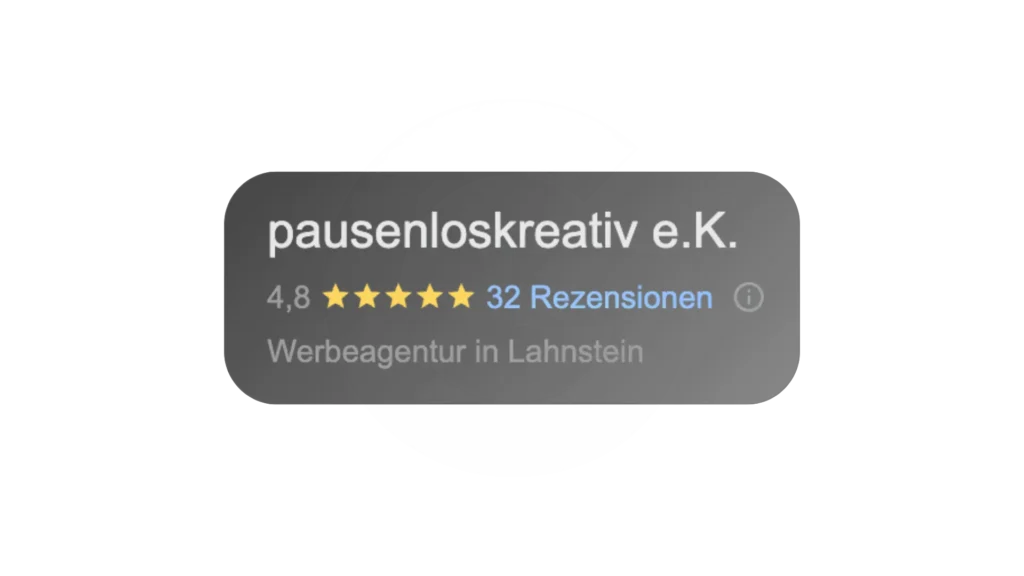 Gepostet auf Silke KlapdorTrustindex überprüft, ob die Originalquelle der Bewertung Google ist. Bei Pausenloskreativ passt einfach alles: Vom Layout bis zur Fahrzeugfolierung ist man hier bestens beraten und versorgt. Ich liebe meine Fahrzeuge, die Sabrina Schmitt und ihr Team mit ihren Folien sichtbar und einzigartig gemacht haben. Jedes Fahrzeug darf künftig hier poliert werden, denn es ist enorm welchen Mehrwert es mir in Sachen Sichtbarkeit gebracht hat!Gepostet auf Rene ErbstrohTrustindex überprüft, ob die Originalquelle der Bewertung Google ist. Ich habe Pausenloskreativ mit der Standortgestaltung meines Fotostudios beauftrag. Es war eine Scheibe mit dem Motiv eines meiner Fotos zu folieren um den Nachbarn den Blick in den Arbeitsbereich zu nehmen. Sabrina Schmidt hat meine Vorstellungen perfekt umgesetzt und saubere und schnelle Arbeit geleistet. Vielen Dank dafür!Gepostet auf Martin KemmlerTrustindex überprüft, ob die Originalquelle der Bewertung Google ist. Wir haben bereits einige Folierer kennengelernt, um unsere Firmenfahrzeuge (Malerbetrieb) individuell gestalten zu lassen – unser Anspruch war dabei stets, etwas Besonderes zu schaffen. Trotzdem wirkten die Ergebnisse am Ende oft… na ja, eher unspektakulär. Durch Zufall sind wir auf Instagram auf Sabrina und Claudia von Pausenloskreativ gestoßen – und was sollen wir sagen? Chapeau! Von der detaillierten Planung und Konfiguration durch Sabrina bis zur präzisen und leidenschaftlichen Umsetzung durch beide – hier stimmt einfach alles. Kreativität, Qualität und Persönlichkeit auf einem ganz neuen Level. Wir sind begeistert vom Ergebnis und freuen uns schon jetzt auf die nächsten Fahrzeuge, die wir mit euch gemeinsam gestalten dürfen!Gepostet auf Alev ColakTrustindex überprüft, ob die Originalquelle der Bewertung Google ist. Pausenloskreativ verleiht mit ihrem einzigartigen Ansatz Unternehmensflotten, Fenstern und Werbeplakaten eine unverwechselbare Präsenz. Die Designs sind nicht nur Hingucker, sondern auch funktional und durchdacht. Wer seine Marke sichtbar machen möchte, ist hier in den besten Händen. Sie verstehen es, mit viel Liebe zum Detail und einem Gespür für Trends die perfekten Lösungen zu finden - sei es für Fahrzeuge, Fensterfronten oder großformatige Plakate, ein echtes Highlight für jedes Unternehmen, das aus der Masse herausstechen möchte.Gepostet auf Tims FPV MediaTrustindex überprüft, ob die Originalquelle der Bewertung Google ist. Professionelles Team und super ArbeitGepostet auf Timo AnhäuserTrustindex überprüft, ob die Originalquelle der Bewertung Google ist. Seit meiner Gründung im Jahre 2023 bin ich Kunde von Pausenloskreativ. Vom Logo Design, Gestaltung Arbeitskleidung Fahrzeugbeschriftung, Stempel und Merch und vieles wurde ich bisher nie enttäuscht und war mehr als zufrieden mit der guten Qualität, umfassenden Beratung und Schnelligkeit der Ausführung. Deshalb kann ich Guten Gewissen das Marketingteam von Pausenloskreativ nur wärmstens empfehlen!!Gepostet auf Moritz OsterhausTrustindex überprüft, ob die Originalquelle der Bewertung Google ist. Richtige Adresse beim Thema Folierung. Kompetenz, Zuverlässigkeit und Seriösität wird hier groß geschrieben.Gepostet auf Monika KuckhoffTrustindex überprüft, ob die Originalquelle der Bewertung Google ist. Sabrina hat für uns die Trauerdanksagungen für meinen Vater gestaltet. Wir waren von der Beratung und der abschließenden Ausführung rundum begeistert. Das Preis Leistungsverhältnis ist top. Für die Danksagungen hat meine Mutter sehr viele positive Rückmeldungen erhalten. Wir können die Firma nur weiterempfehlen und werden bei der nächsten Gelegenheit wieder auf Sabrina zurückkommen.Gepostet auf IngoTrustindex überprüft, ob die Originalquelle der Bewertung Google ist. Herausragende und zuverlässige Leistung. Danke an das Team von pausenlos kreativ. Erst hatten wir einen Termin und alles durchgesprochen und dann kam die Kollegin und beklebte meine Schaufenster. Ich erhalte fast jeden Tag Zuspruch von den Menschen auf der Straße wie gut das hier aussieht. Ich müsste also noch viel mehr Sterne geben. DankeschönGepostet auf PS360Trustindex überprüft, ob die Originalquelle der Bewertung Google ist. Von der Planung bis zur Umsetzung perfekt!